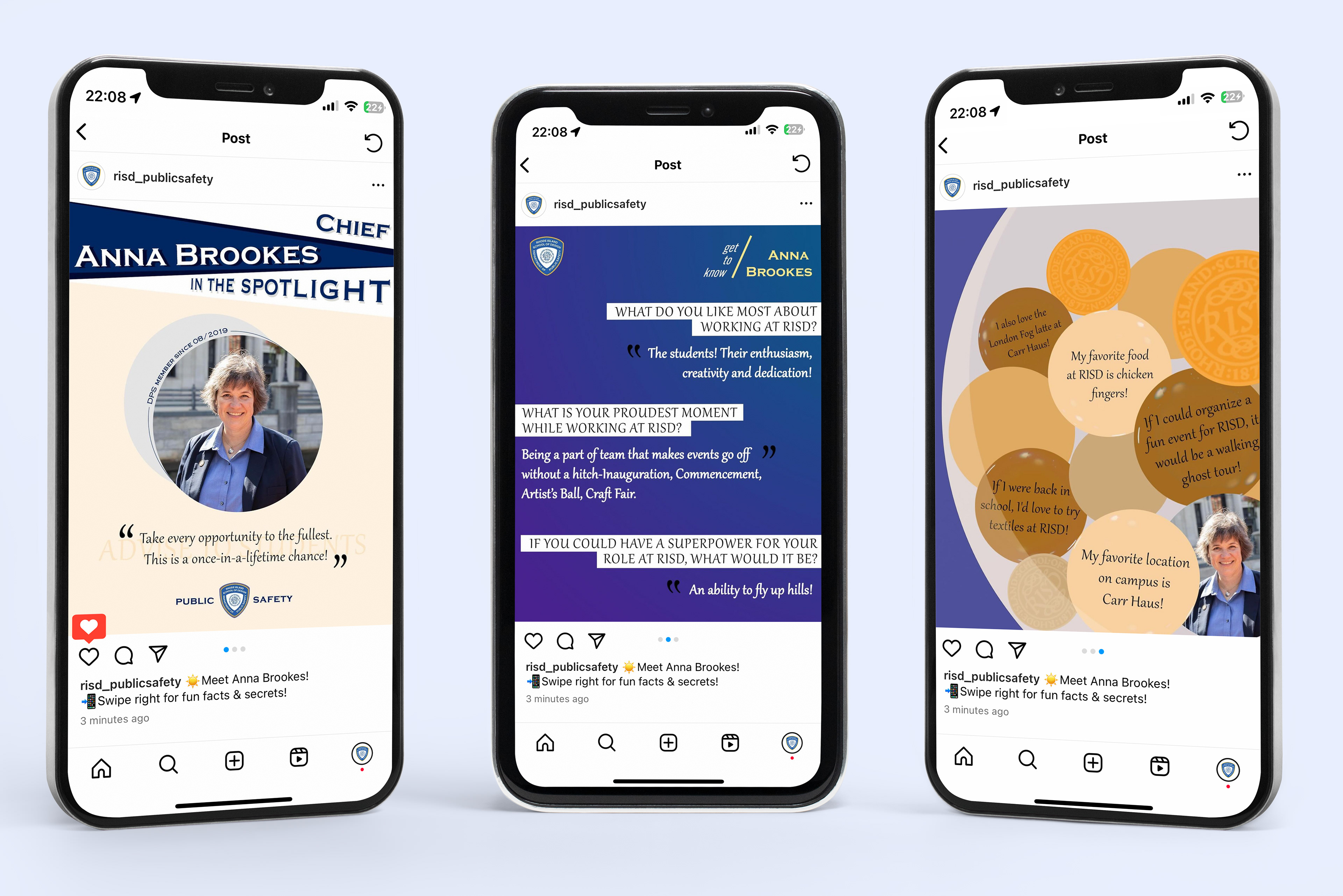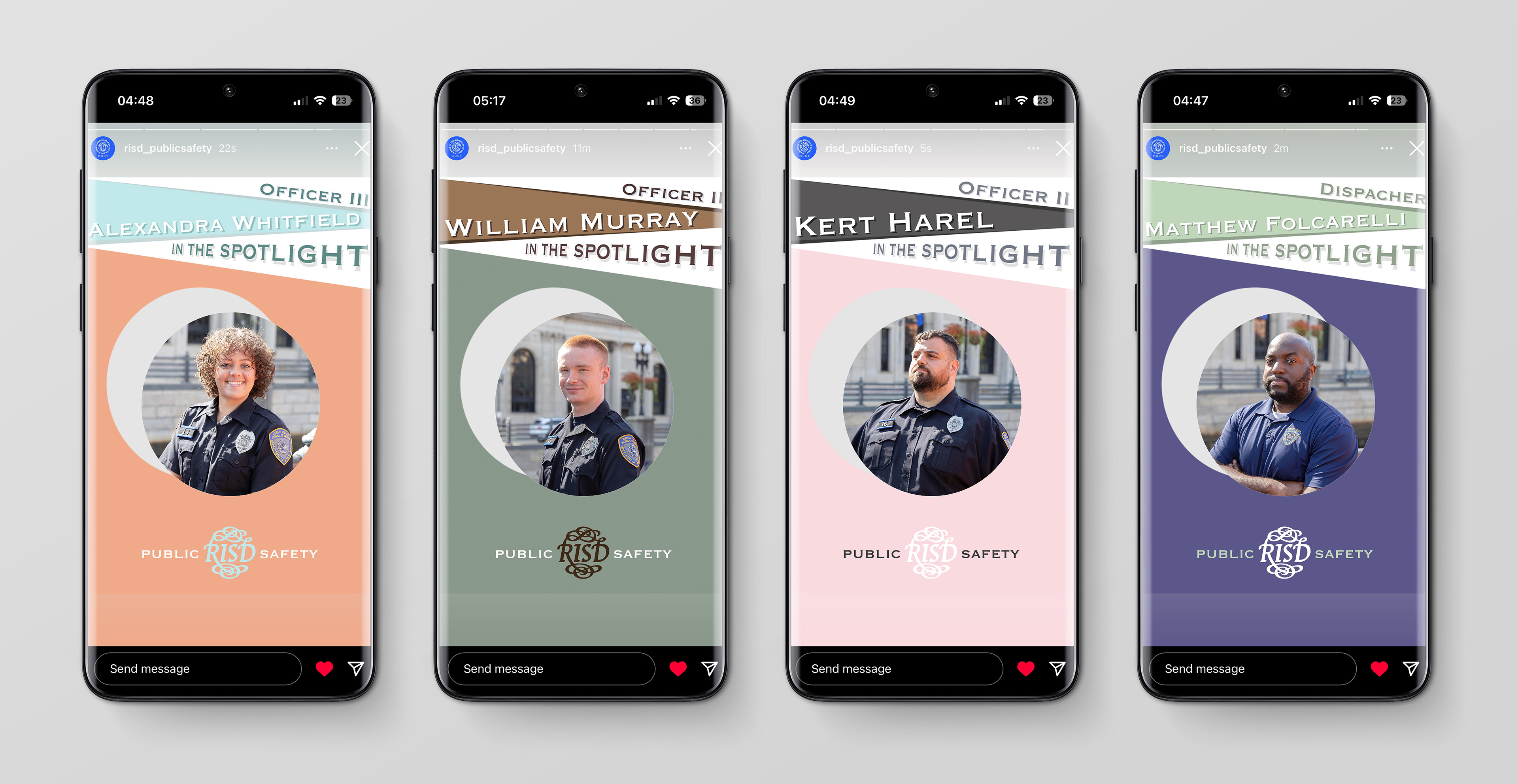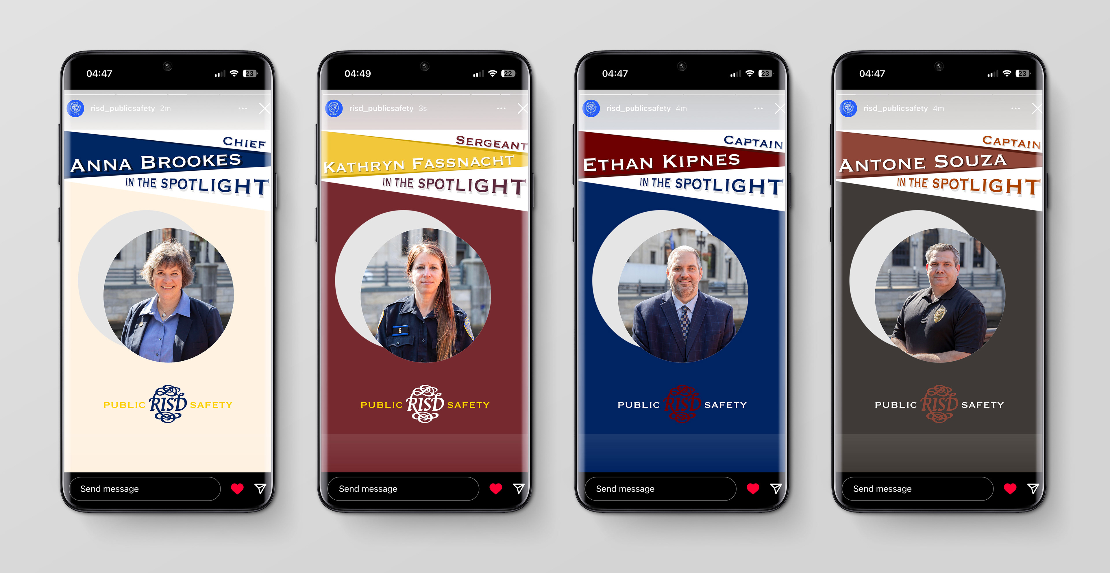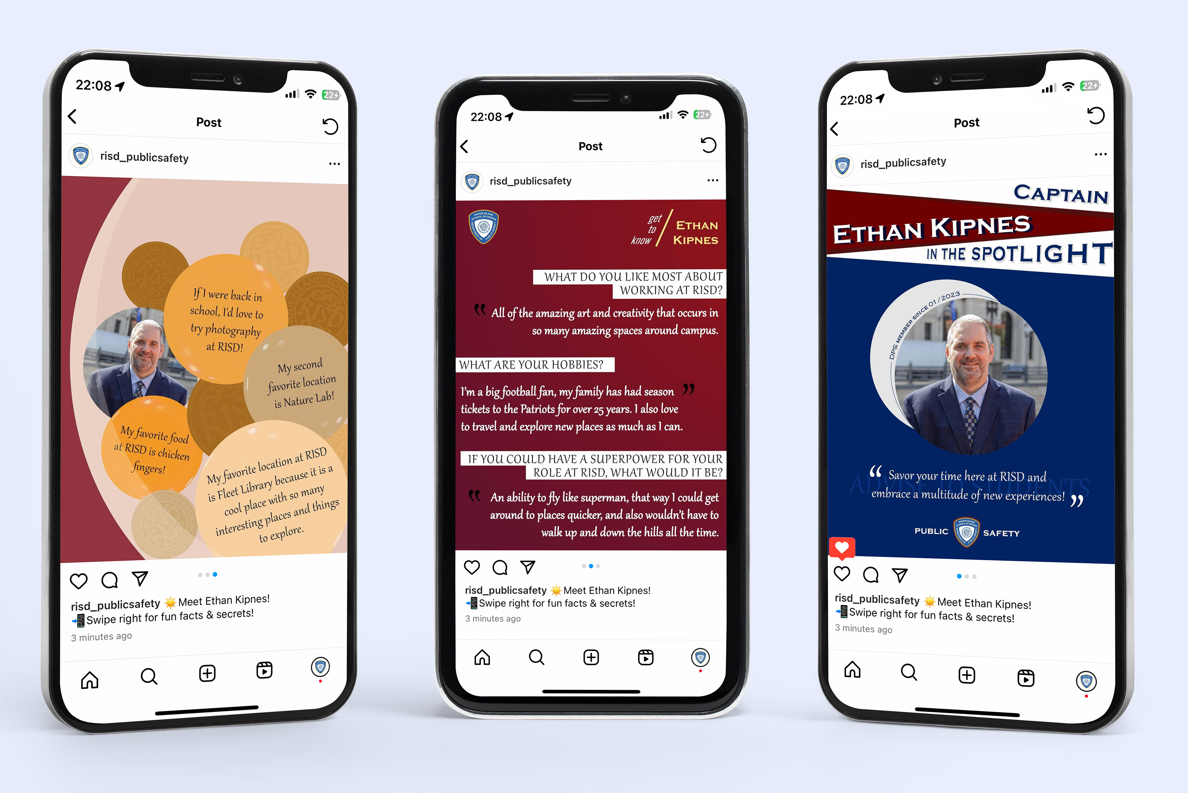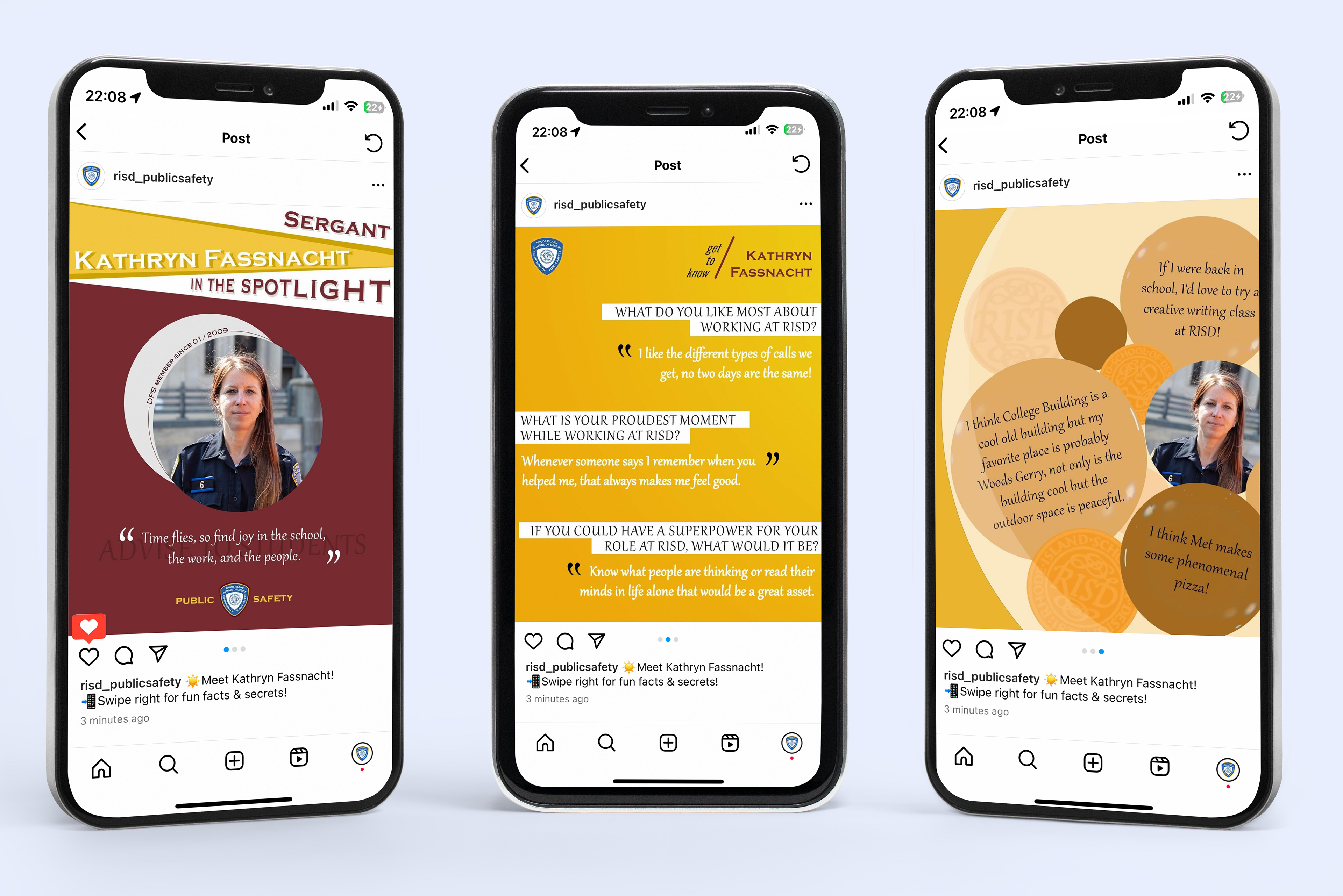 Designed to spotlight RISD Public Safety Officers and introduce them to the RISD community, the Officer Spotlight Layout Designs offer an engaging and personalized glimpse into the lives of these individuals.