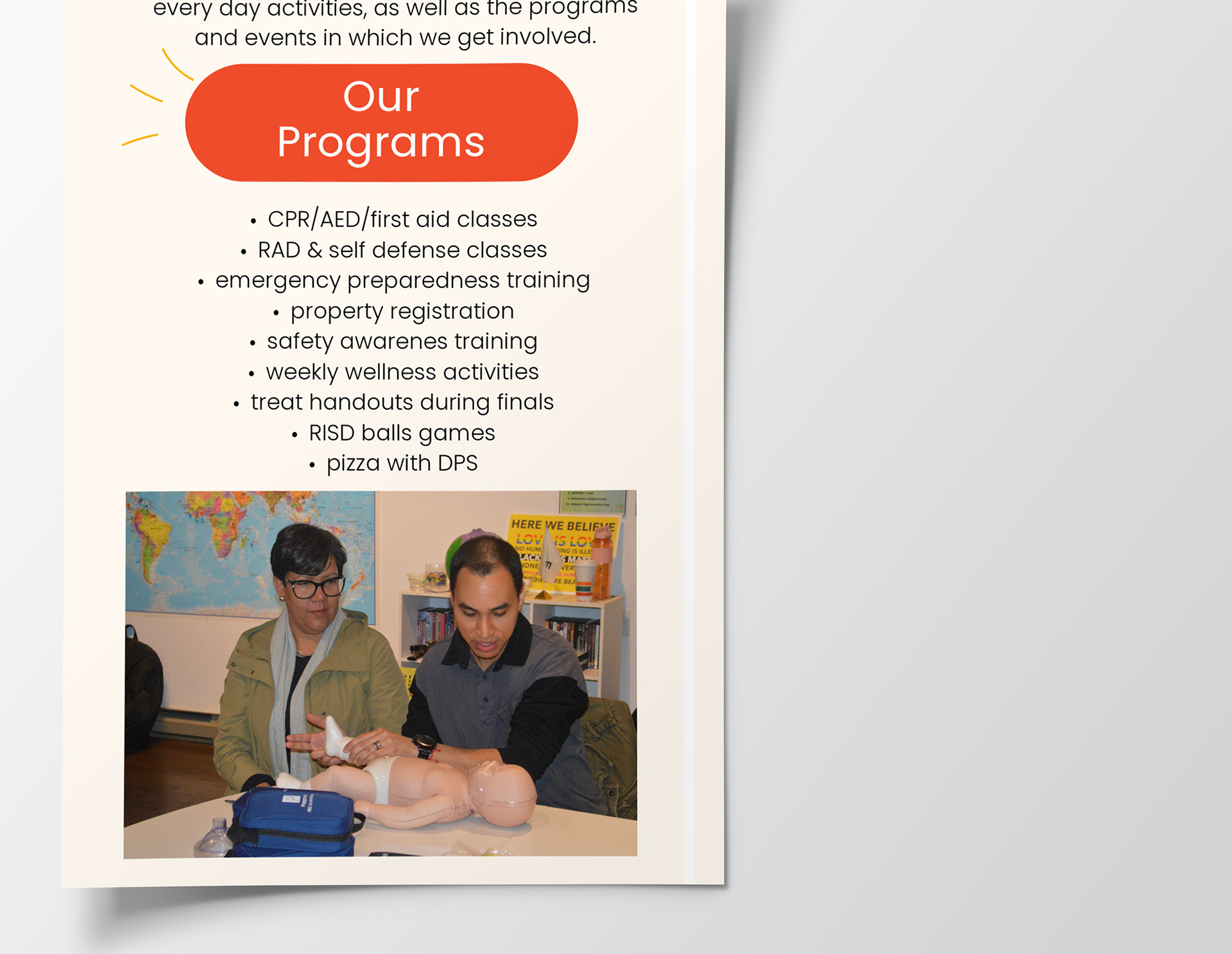 Being their photographer, snapping pictures at every event they organize. One of the most fulfilling events is their CPR class, where people learn life-saving skills.